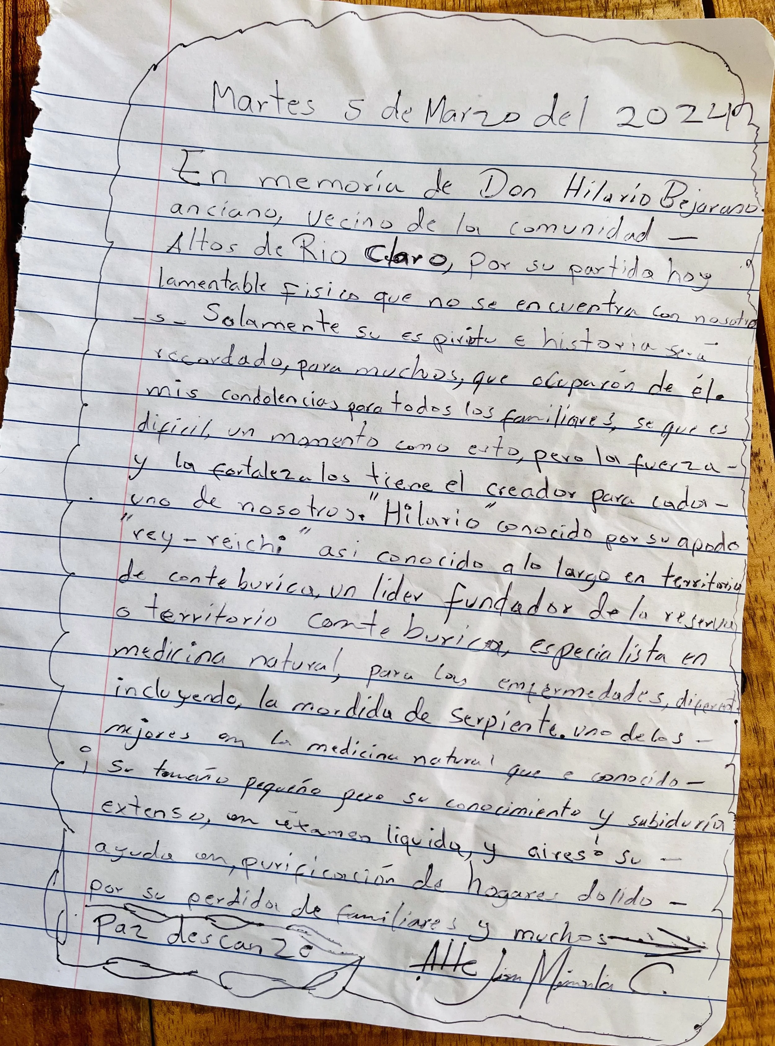 In memory of Don Hilario Bejarano, an elder, resident of the Altos de Rio Claro community, for his unfortunate departure today, he who is not with us. Only his spirit and history will be remembered, for many, who cared about him. My condolences to all the family members, I know it is difficult, a moment like this, but the Creator has strength and fortitude for each of us. Hilario known by his nickname "King Reichi" as well known throughout the territory, a founding leader of the territory, a specialist in natural medicine, for different diseases including snakebite. One of the best in natural medicine that I have ever known - his small size but his knowledge and wisdom was extensive, in liquid and air examination! And his help in purifying homes carrying pain. For his loss…family members and many more…Peaceful rest. Atte, Juan Miranda C.