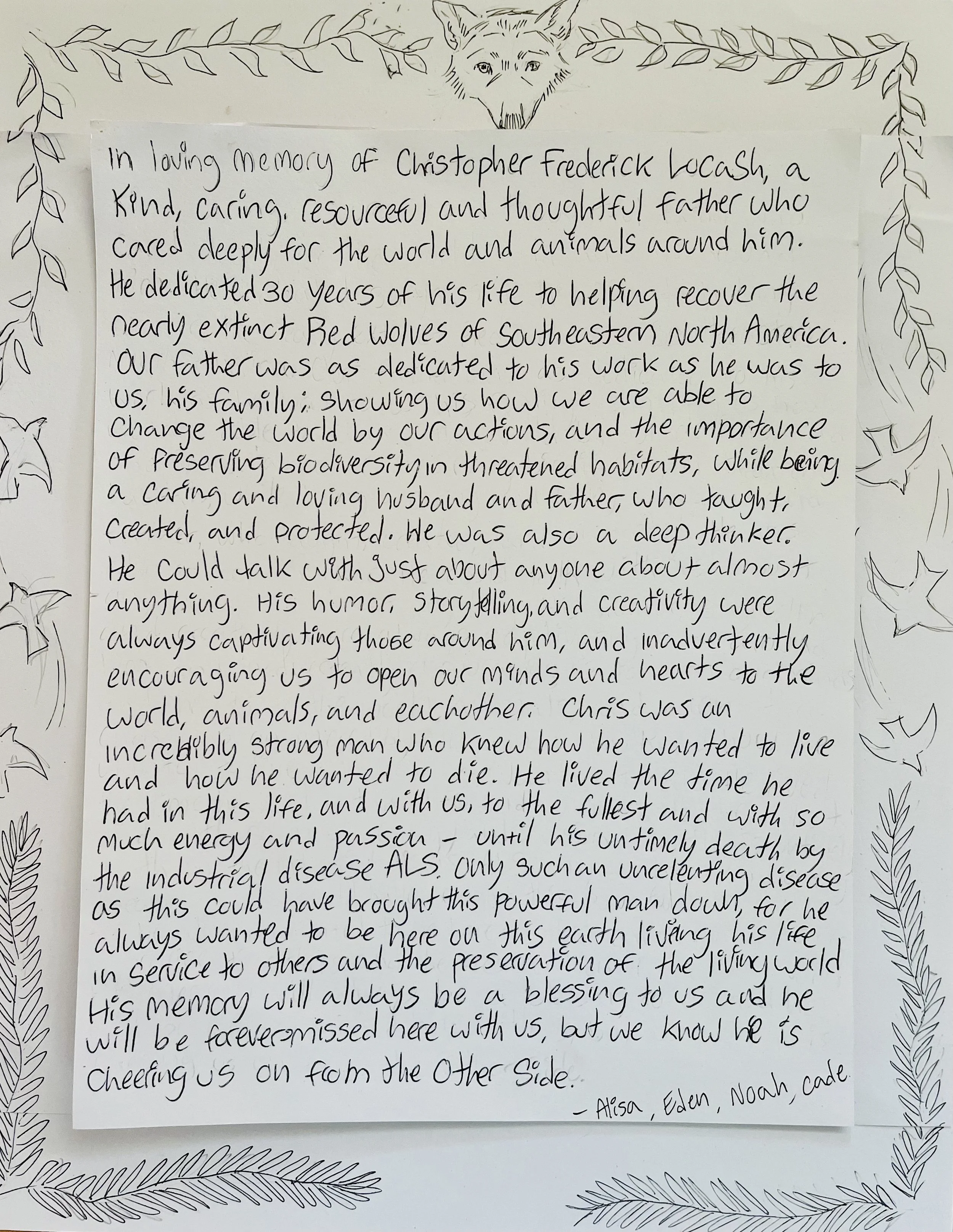 En memoria de Christopher Frederick Lucash, un padre amable, afectuoso, ingenioso y reflexivo que se preocupaba profundamente por el mundo y los animales que lo rodeaban. Dedicó 30 años de su vida a ayudar a recuperar a los casi extintos lobos rojos del sureste de América del Norte. Nuestro padre estaba tan dedicado a su trabajo como a nosotros, su familia; mostrándonos cómo podemos cambiar el mundo con nuestras acciones y la importancia de preservar la biodiversidad en hábitats amenazados, siendo al mismo tiempo un esposo y padre cariñoso, que enseñó, creó y protegió. También fue un pensador profundo. Podía hablar con casi cualquier persona sobre casi cualquier cosa. Su humor, narración y creatividad siempre cautivaron a quienes lo rodeaban y, sin darnos cuenta, nos alentaron a abrir nuestras mentes y corazones al mundo, a los animales y a los demás. Chris era un hombre increíblemente fuerte que sabía cómo quería vivir y cómo quería morir. Vivió el tiempo que tuvo en esta vida, y con nosotros, al máximo y con tanta energía y pasión, hasta su prematura muerte por la enfermedad industrial ELA. Sólo una enfermedad tan implacable como ésta podría haber derribado a este hombre poderoso, porque siempre quiso estar aquí en esta tierra viviendo su vida al servicio de los demás y la preservación del mundo viviente. Su memoria siempre será una bendición para nosotros y siempre lo extrañaremos aquí con nosotros, pero sabemos que nos está animando desde el Otro Lado. Para siempre, Alisa, Eden, Noah & Cade